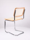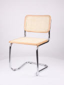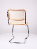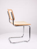 Schwingstuhl, stapelbar, Gestell aus Stahlrohr verchromt, Holzrahmen natur lakiert, Sitz und Rücken echtes Flechtwerk, natur lackiert, mit Armlehnen aus Buche massiv.