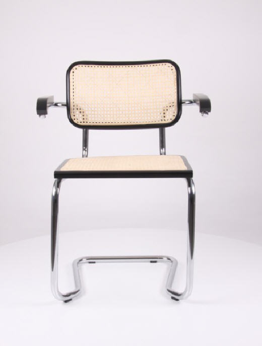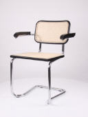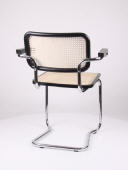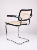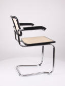 Schwingstuhl, stapelbar, Gestell aus Stahlrohr verchromt, Holzrahmen schwarz lakiert, Sitz und Rücken echtes Flechtwerk, natur lackiert, mit Armlehnen aus buche massiv