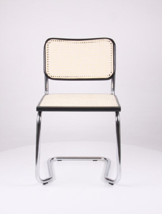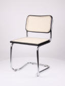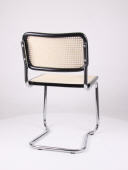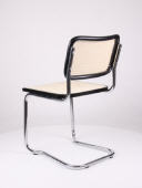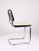 Schwingstuhl, stapelbar, Gestell aus Stahlrohr verchromt, Holzrahmen schwarz lakiert, Sitz und Rücken echtes Flechtwerk, natur lackiert.